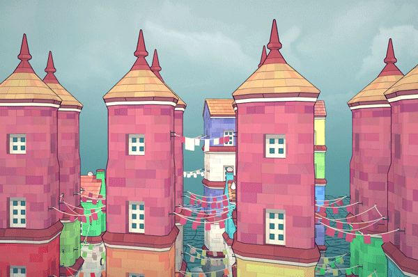 彩旗会在间隔1或者2个空间间隙的2层及以上建筑物之间生成,建筑物需满足上一层建筑基块与下一层的颜色不同。