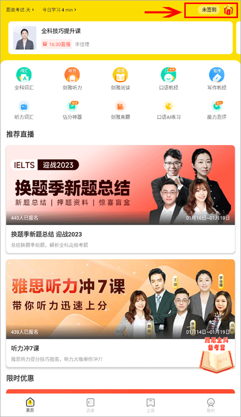 怎么看回放1、首先我们打开土豆雅思app,在选课界面选择你已经报名的课程并点击。