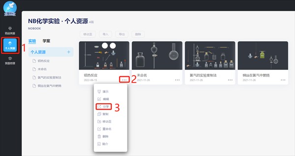 ①直接在精品资源页面,点击相应实验的“ · · · ”,点击“分享”