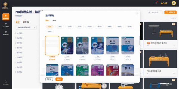 NOBOOK虚拟实验包含很多精品资源,也支持众多实验模块的自主探究,例如物理学科的力,热,声、光、电与磁、家庭电路、近代物理、力与运动与受力分析这九大模块,化学学科的无机化学与电化学模块,都可以通过自由组装来完成实验的DIY探究。