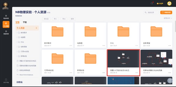 1.在左上角选择对应的学段,点击右上角的新建资源,选择对应的模块,即可进入到相关的实验界面,以物理电与磁模块为例