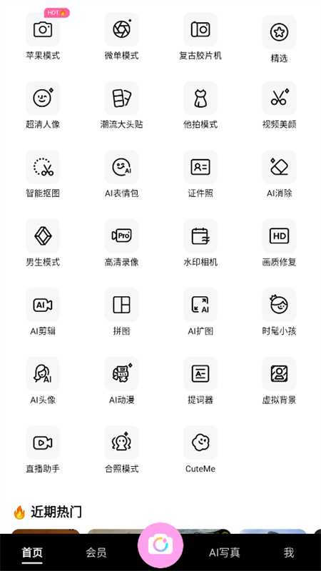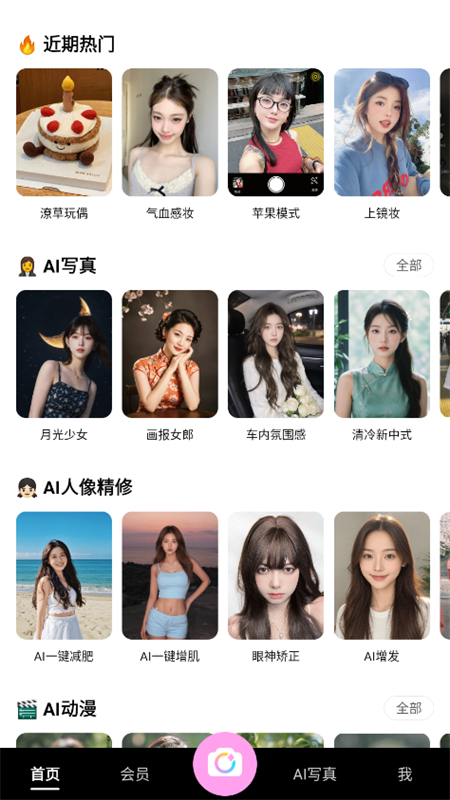 美颜相机2025最新版本,英文名叫BeautyCam,这是一款年轻人都在用的潮流APP。软件内置多种拍照模式,包括苹果模式、原生模式、微单模式以及合照、帮拍等模式,满足你对不同场景的拍照需求。并且提供给用户海量模版、滤镜、特效、贴纸等资源,用户可以下载喜欢的进行拍摄并编辑保存。软件目前利用强大的ai技术,提供给用户ai人像精修、ai写真、ai绘画等多种服务。使用这款软件可以让你更出片!