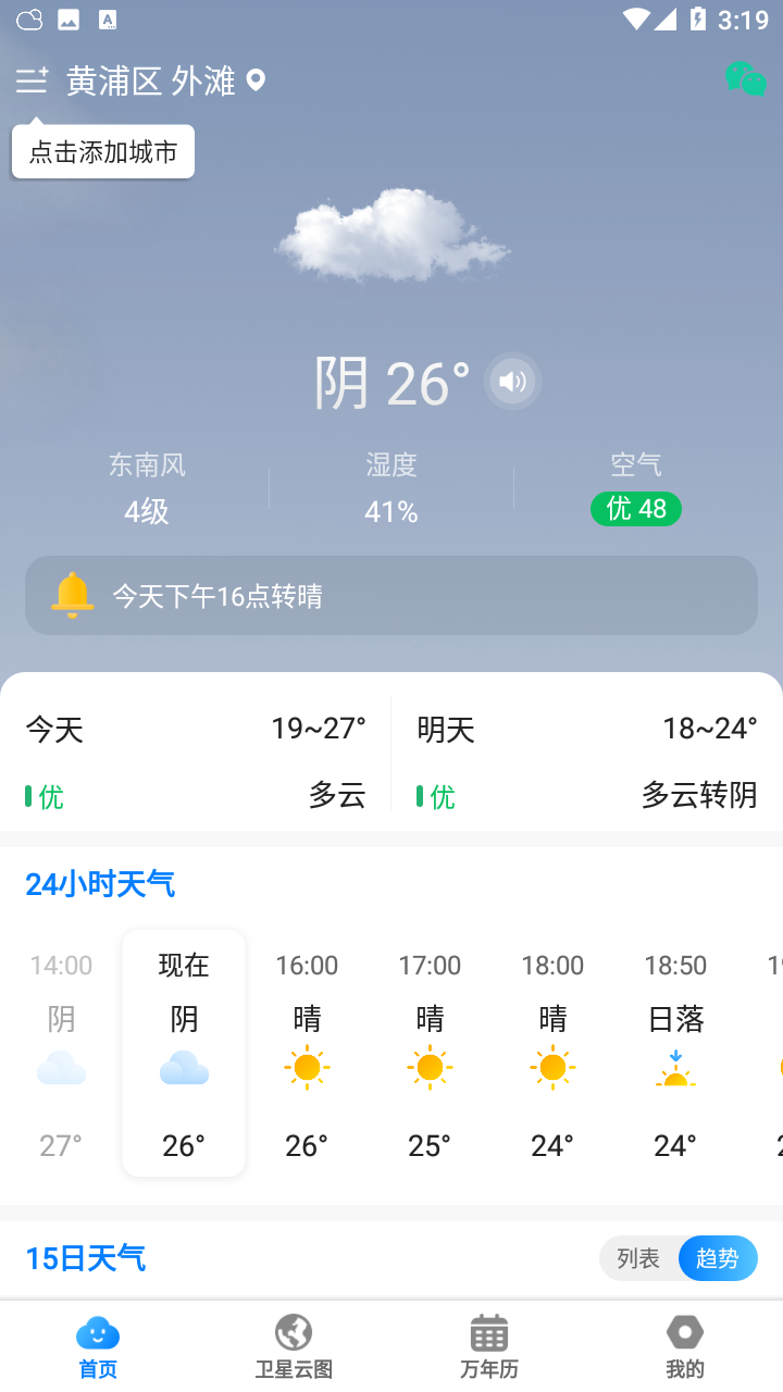 【逐小时天气预报】轻松查阅24小时内天气变化,提早预防早晚温差过大;