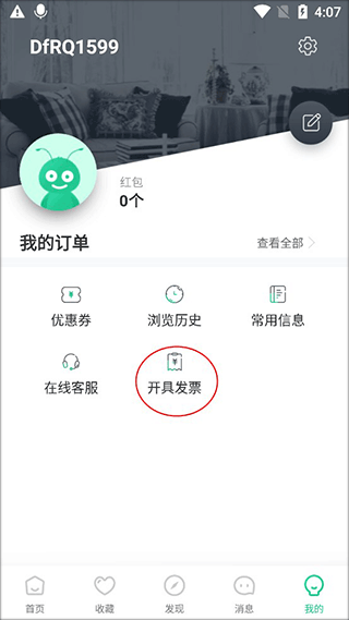 1、我们进入到【我的】个人界面,在界面里点击开具发票。