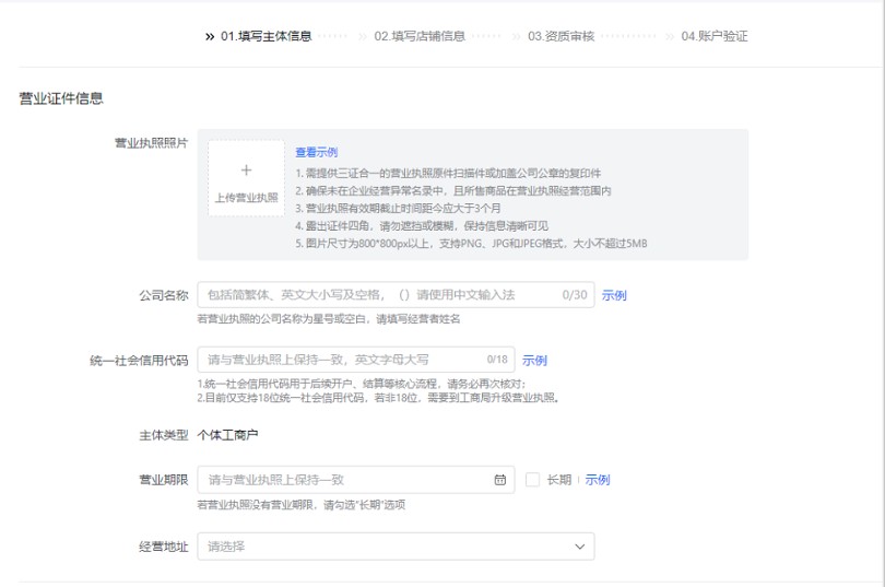 然后选择手机验证码注册。注意:不要使用抖音号,头条号注册,以防账号出现问题,店铺无法登录。2. 选择店铺类型 我们准备的是个体营业执照,直接选择个体工商局就可以。至于为什么不让你们选择个人店,企业店。主要是因为个人店限制太多,没有发展空间,企业店操作过于繁多,需要走对公账户,缴纳税务。最主要的是缴纳的保证金会比个体店的贵一倍。但是这两种店铺类型在流量和权重上又没有明显的差别。三种店铺类型经过反复的对比,发现还是个体店更适合新手商家。