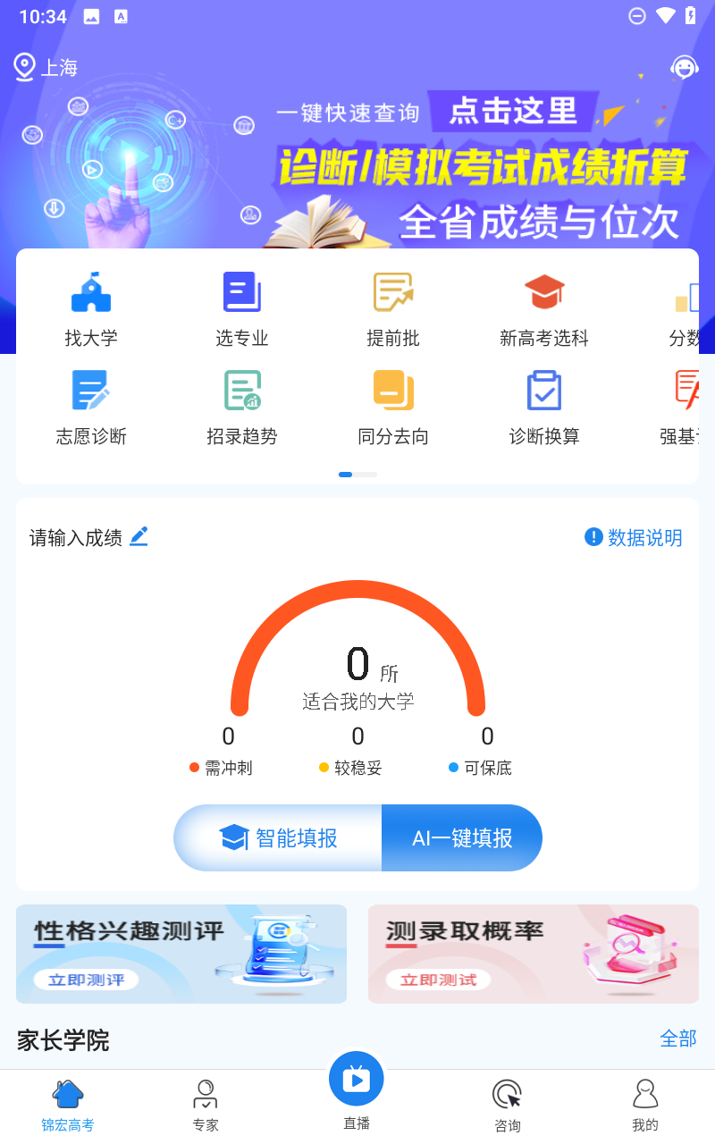 锦宏高考是一款全方位的高考志愿填报服务软件,能够提供院校优先、专业优先、一键填报、查找大学找专业等服务,还有录取概率预估、性格测评、高考锦囊等专业信息参考。专业的一对一资讯服务多重分析,帮助您规划高考寻找高效学习的方法,并且锦宏高考实时紧跟最新高考形式为你提供参考。若您正被高考志愿填报没有信息所困,请即刻下载锦宏高考,为您解决顾虑!
