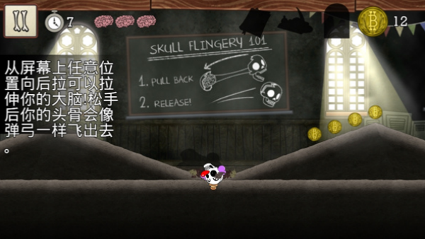 2、操作方式很简单,在屏幕上的任意位置向后拉,就可以把骷髅的大脑拉出来(听起来好血腥),松开手后骷髅就会像弹弓一样飞出去。当骷髅飞在半空中的时候,点击屏幕会让时间变慢,拉动屏幕可以让骷髅在空中也做出弹射。