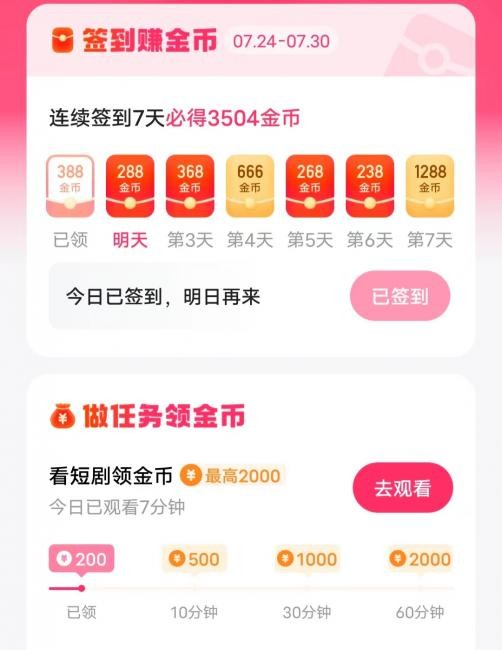 2、每天看短剧领金币,观看5分钟领200金币,观看10分钟领500金币,观看60分钟领2000金币,每天看一小时短剧可赚0.37元。
