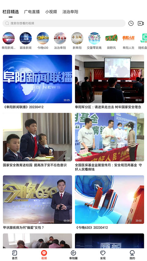 2、然后会看到首页、主播圈、看电视、发现、我的五个板块,其中在首页中有着阜阳、本地要闻、视频、推荐、金融、等诸多类型的新闻要素可供查看