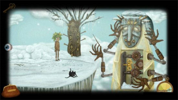 3、左走到头,出门看见一只绿色的甲虫警卫,对话虫子告诉她巫师所在的山只在冬天出现,找到钟表匠可以改变季节,下楼,三岔路口,往前走看见季节时钟,使用后发现是坏的,