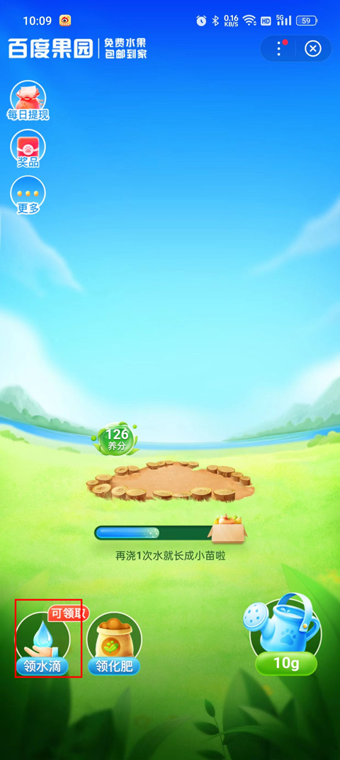 1、进入到果园之后,点击下方的领水滴、化肥;