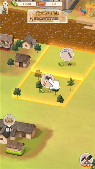 4、由于路不平,我们需要清理路面的东西,点击斧头即可清理树木,点击镰刀,即可收取庄稼;