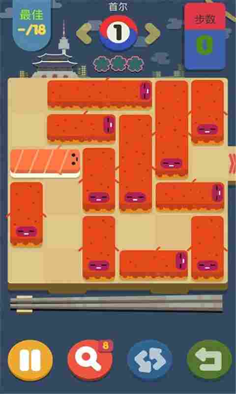 游戏玩法:通过滑动,想方设法将寿司传送出去,克服阻碍,最终才能拿出你想要的可口寿司。
