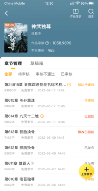 作品创作:支持创建作品,便捷发布、修改章节、保存草稿