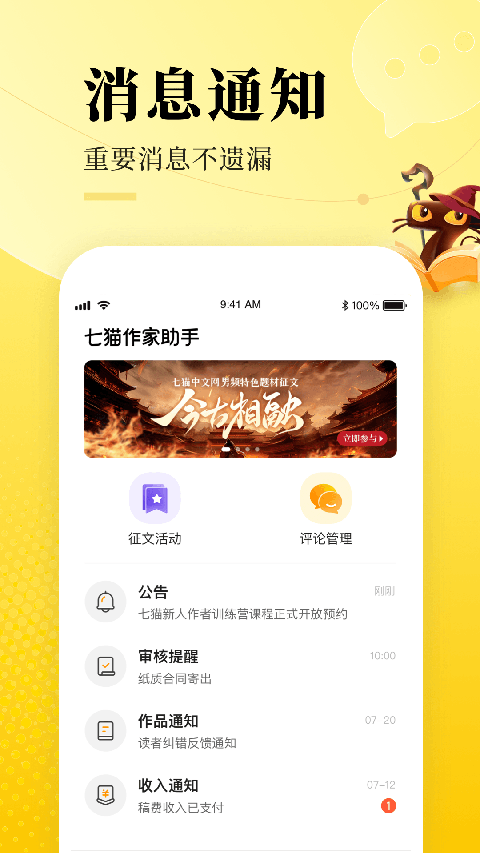 消息通知:支持查看公告、审核提醒、作品通知、收入通知、征文活动等重要消息通知