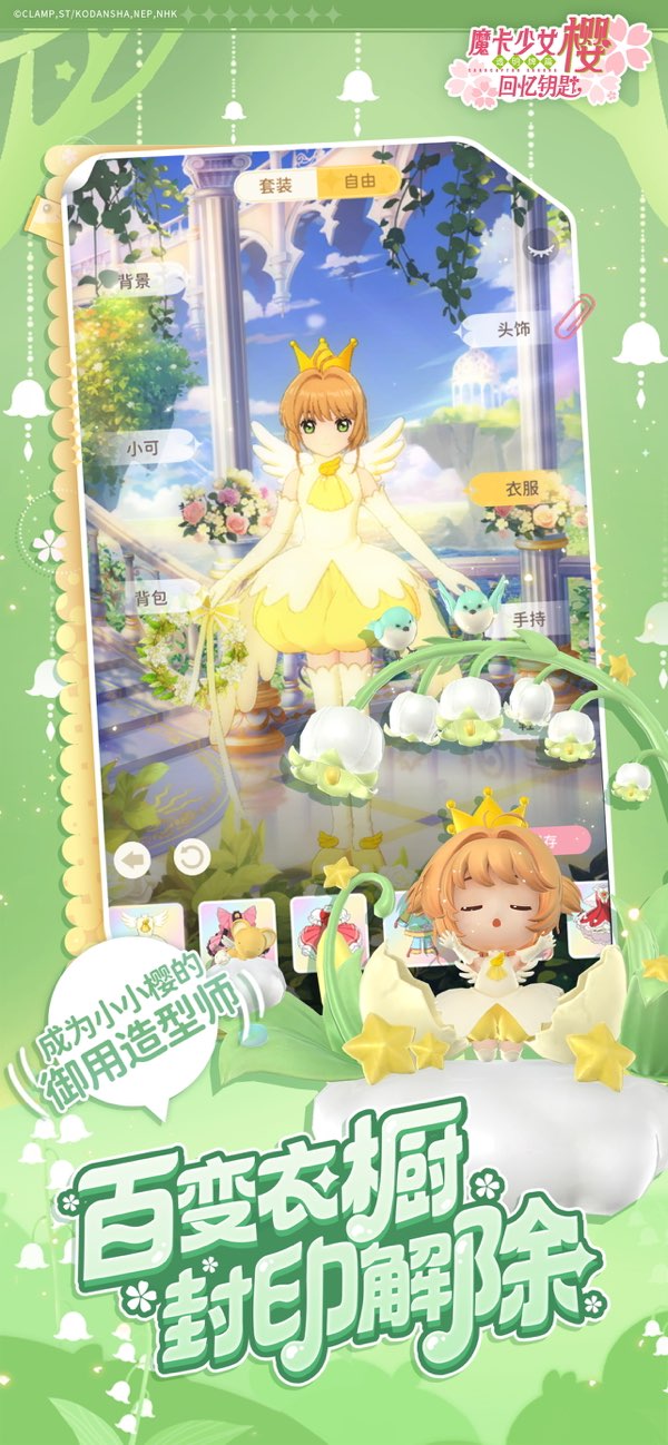 小时候的你是否想过成为库洛魔法使,骑着法杖在天上飞来飞去收集库洛牌呢,是否想过有一个暖心可爱的闺蜜给你设计漂亮的服装和拍照呢,是否想过玩偶一样的萌物可鲁贝洛斯陪伴在自己身边呢,还有帅气的哥哥与哥哥好友、暗恋的同班同学,等等等等。这一切都在《魔卡少女樱回忆钥匙》中得到满足,在这个游戏中,你将成为一名库洛魔法使,邂逅一张张卡牌,缔造不一样的魔法人生。