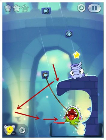 技巧:这一关通过额外任务的只有一个方法,不过运气成分有点高,主要是切割糖果上面和右边绳子的相隔时间,掌握一个时间间隔就能快速掉到下面的石壁(而不被Toss抓到),进行一个反弹,然后收集两颗星星并过关。