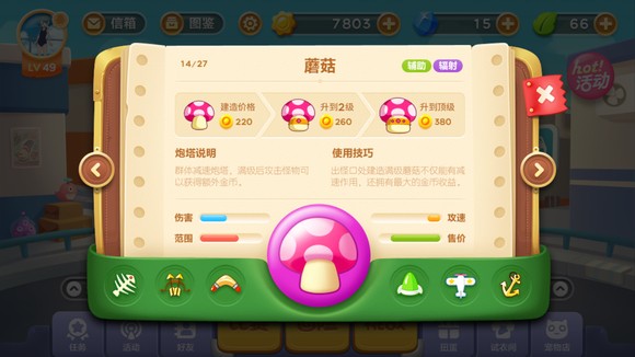 蘑菇可以喷出泡沫使怪物减速,满级后可以获得金币加成;在初代,当时它叫“深海蘑菇”,在二代,被磁铁炮塔取代;在三代,蘑菇炮塔正式回归并且攻击时有了全新的音效。