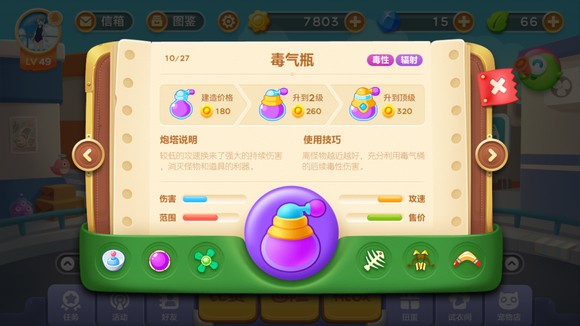 便便炮塔是我们熟知的伙伴,它的味道十分古怪,但是会对怪物造成大幅减速,攻击距离也跟近,伤害也跟低,在二代,便便炮塔换上了一个全新的造型,在三代的游乐园主题中,便便炮塔正式回归,并且继续保留原造型,而且满级后有几率能够对周围目标造成减速。