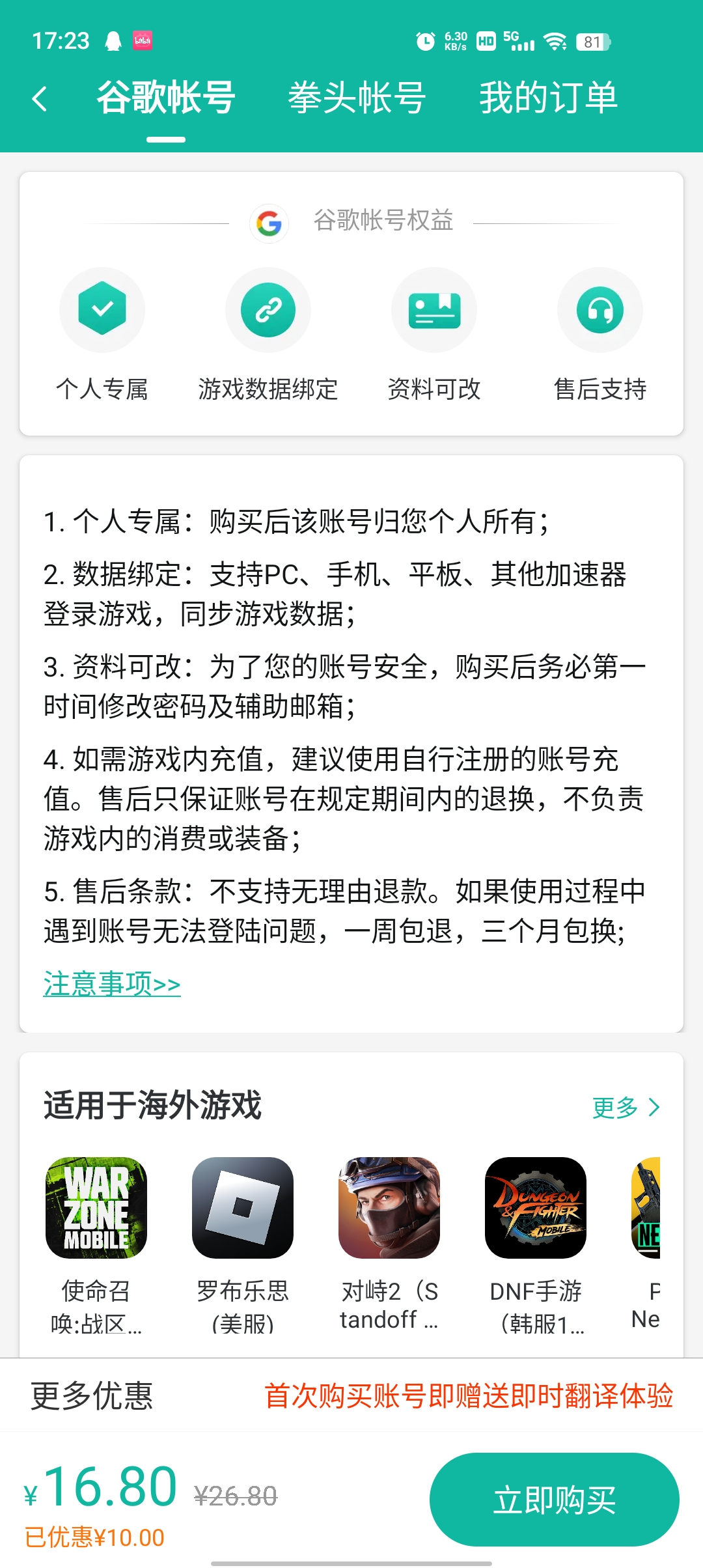 1、支持全中文一键获取谷歌账号/拳头账号,告别游客版,游戏进度实时同步,轻松解决外服游戏账号注册难的问题。