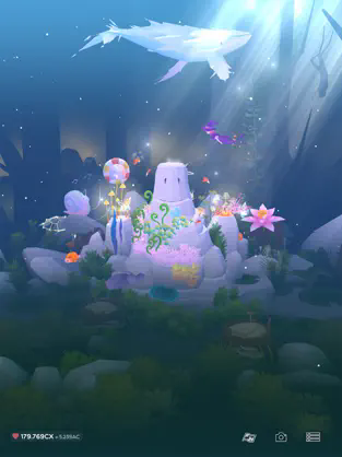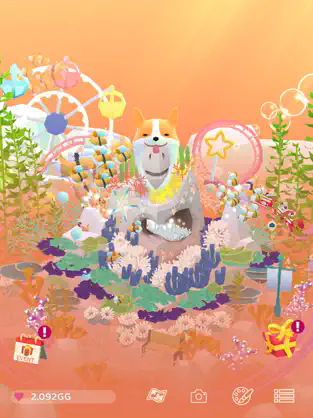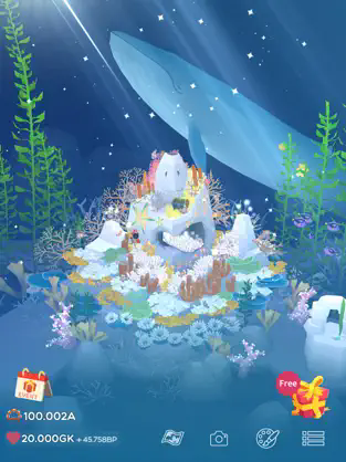 4、我们还可以通过给鱼儿们拍照,完成目标、签到及每日任务,来获得相应奖励。如果不知道做什么,也可以点击右上角奖杯图标,完成任务,成长速度会更快。之后可以根据指引实现扩张,采到新地形,获得宽岩石和海胆,包括篱笆套景。点击神秘箱,会开到【海星】和一些生命额,还有可能是贝壳的饰装。