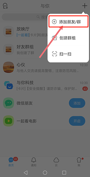 2、在下拉菜单里点击“添加朋友/群”;