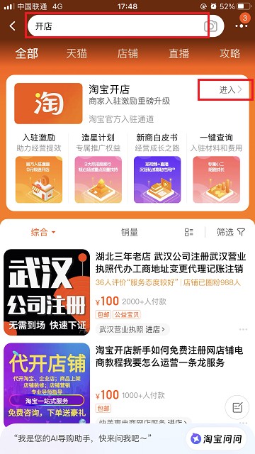 在淘宝官方网站顶部点击【免费开店】或手机淘宝搜索【开店】进入淘宝开店入口