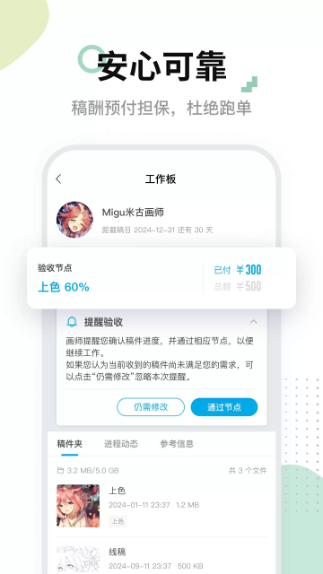 值得一提的是,线上约稿所面临的诚信问题一直是行业顽疾,不仅骗稿、跑单等现象时有发生,为此引出的线上骂战更是屡见不鲜。面对诚信与安全问题,米画师选择把关键信息透明化:包括稿件需求、价格预算、画师风格在内的条目都一目了然,配合自建的信誉系统,保证每个用户的评价真实可见。与此同时,米画师也借鉴了电商的成功经验,以预付保证金的方式来担保交易安全、顺利地进行,在一定程度上让纠纷出现率降到更低。
