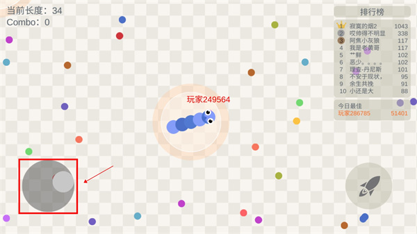 2、拖动摇杆控制小蛇的方向,吃掉地图上彩色的小豆豆,不断的变长;