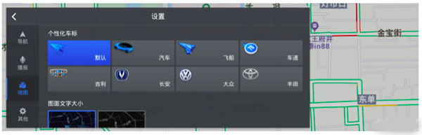 针对车主安装的智能后视镜屏幕大小、比例千差万别的特点,高德地图车镜版提供了地图分辨率自适应、界面文字大小可设置等灵活操作,方便车主自主调试出最佳的导航视觉。此外,还可将导航图标换成品牌车标、飞船车标甚至是车速车标(即直接显示实时车速),满足个性化需要。
