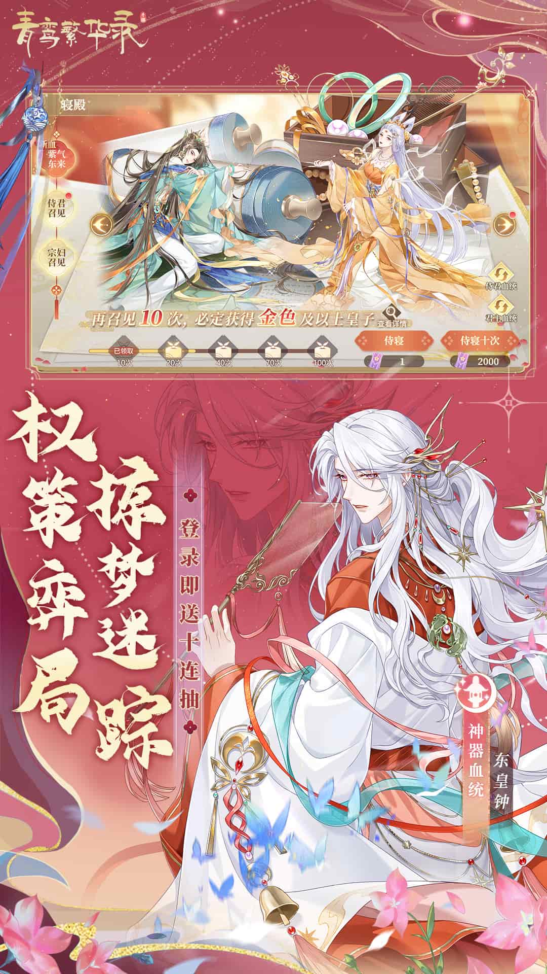 青鸾繁华录vivo版是由南京仙地信息技术有限公司推出的一款国风恋爱类型的手游,游戏主要是偏向女性向的。玩家扮演女帝,自由攻略各色美男子。游戏主打朝堂权谋和浪漫恋爱类型的玩法,让游戏玩起来更加有趣。每位可攻略角色都拥有完整独立的故事线,配合动态表情和磁性的声音,带来沉浸式恋爱体验。游戏还特别设计了多结局分支系统,有喜欢的玩家可以下载来试试。