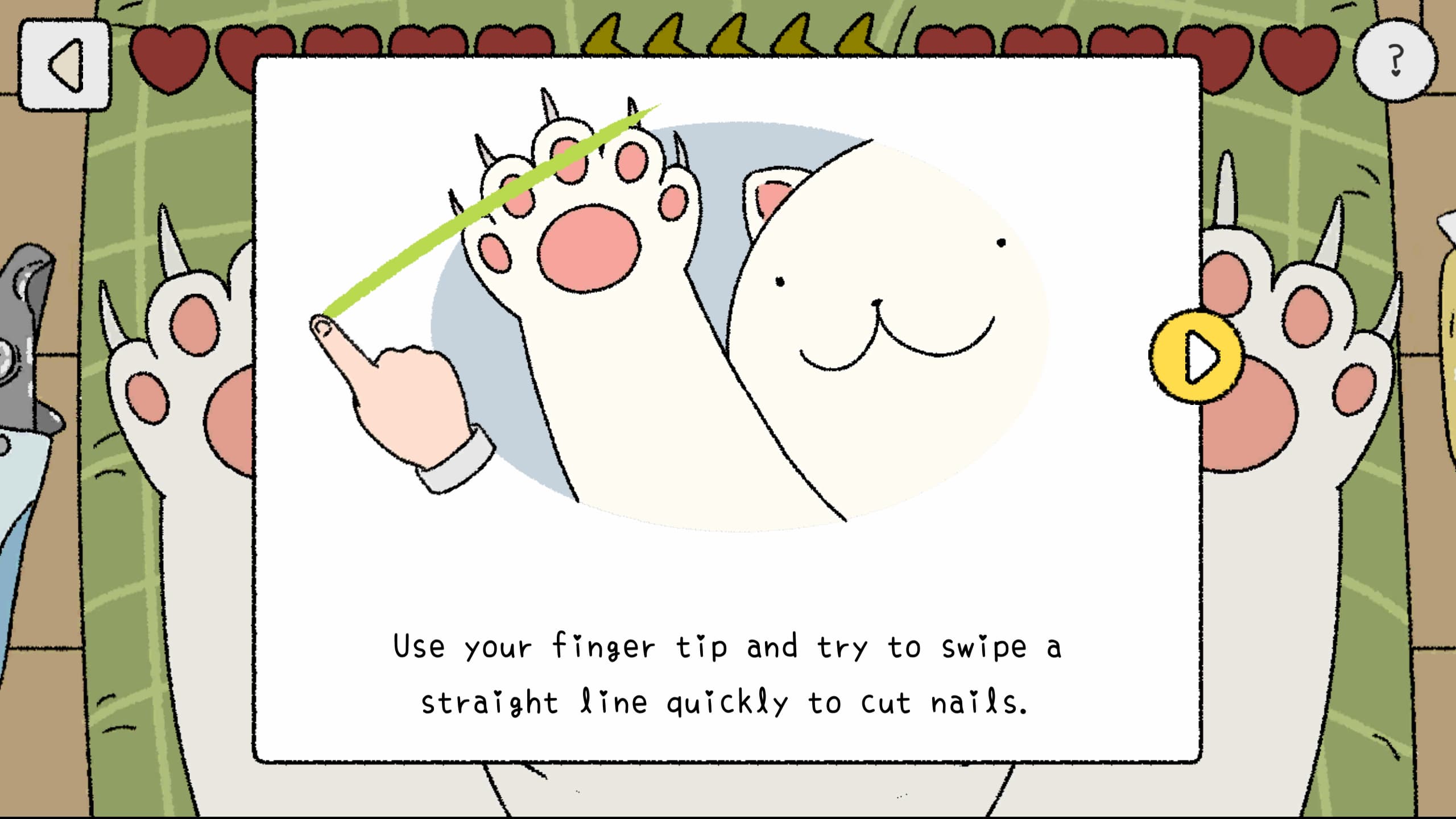 给喵喵剪指甲,通过手指滑动就能够把指甲剪掉,这个是常规操作,回忆起最初给自家喵剪指甲还被它划到的场景,相对其实小游戏这个是最友好的,也比较有趣的。