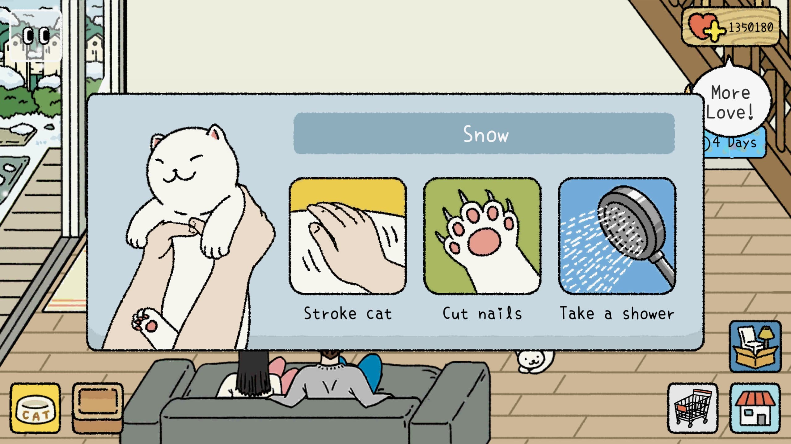 最开始陪伴你的猫咪有三个主要的互动玩法,还是很大程度还原了现实中养猫的体验,特别是在每次做得不对时那一声“喵~~~~”