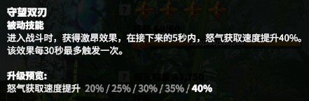 技能组可以增加怒气回复效率,与骑兵的短怒、追求高爆发的特点完美契合。同时【昂奋】技能也和埃莫瑞斯的技能【守望双刃】完美契合,通过触发“激昂”效果,直接触发额外伤害。