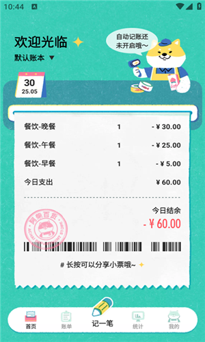 1、进入首页自动打印今日消费小票,记账也有仪式感