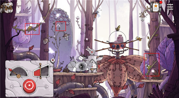 7、往右走,拖动打开所有包围直升机的巨大花瓣。然后调整投石机关,使石头投射在3个藏有黄色虫子的地方。最后切换角色为小女孩,进入直升机,前往下一个星球