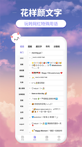 花样颜文字app是一款集成了各式字体、颜文字符号的输入辅助软件,拥有各式各样的字体、丰富多样的颜文字符号,无论是时尚潮流的现代字体,复古韵味的传统字体,还是俏皮可爱的卡通字体以及庄重典雅的正式字体等总有你所中意的一款,能够十分方便的使用到其他社交平台,让你的发言别具一格,有需要的用户赶快下载使用吧!