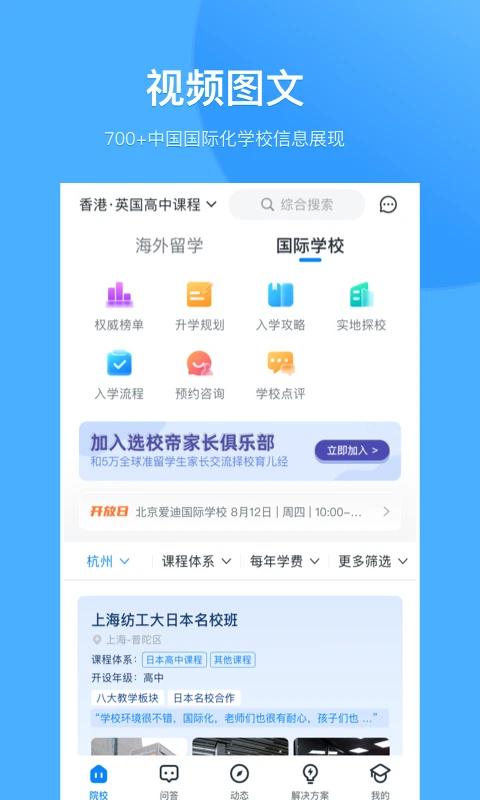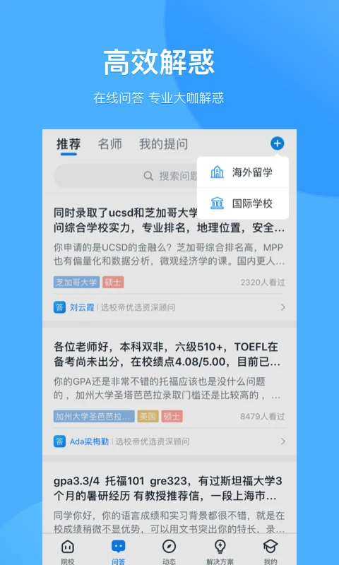 选校帝app是一款专业留学选校服务软件,聚合全球知名高校信息与权威排名,有各种专业介绍,更有名校名师精品留学课学习。有留学前辈的各种解疑答惑,还有留学生活分享,可以提前了解留学生活,结交留学伙伴。通过内置的大数据系统进行精确的智能测试匹配,多维度评价院校,帮你准确推荐适合的名校。有需要的话就赶快下载使用吧!