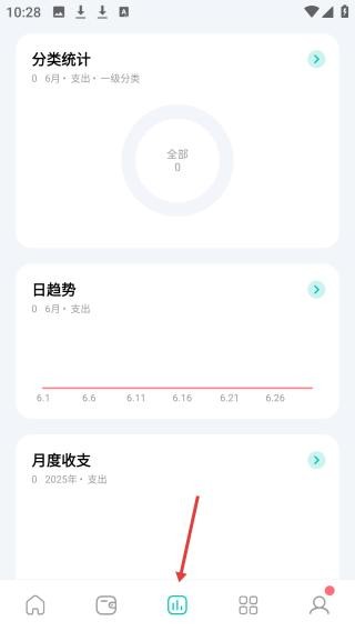 1、点击分类统计页面,呈现6月支出的分类统计、日趋势及2025年月度收支情况,助你掌握财务动态。