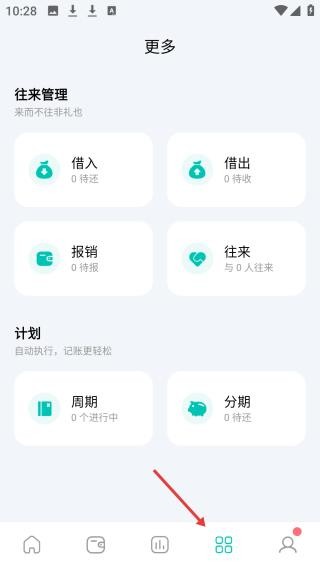 2、点击更多功能页面,设有往来管理借入、借出等与计划周期、分期板块,满足多样化记账需求。