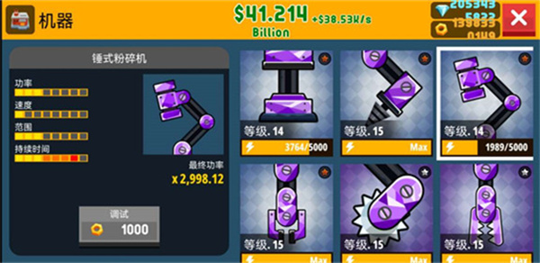 机器的解锁升级:解锁更高端的机器,合理的放置其位置,并对其进行强化升级,能够大大的增进碾压的威力,从而大大增加效益。