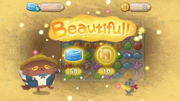 除此之外每局还会得到罐头和金币,罐头可以用来购买消除道具,让通关更加轻松。金币则可以帮可怜的萌喵尼果还债和购买房屋的装饰。接着,你将会在精彩剧情的推动下,慢慢地还清债务,修理破旧的地板和墙壁,以及赎回当初被当掉的家具。