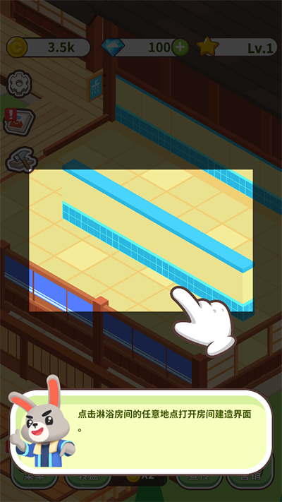 打开游戏后,根据新手指引在浴场的点击淋浴房间的任意地点打开房间的建造界面,开始在自己的浴场里建造淋浴头。这是前期游戏时的经济主要来源哦!