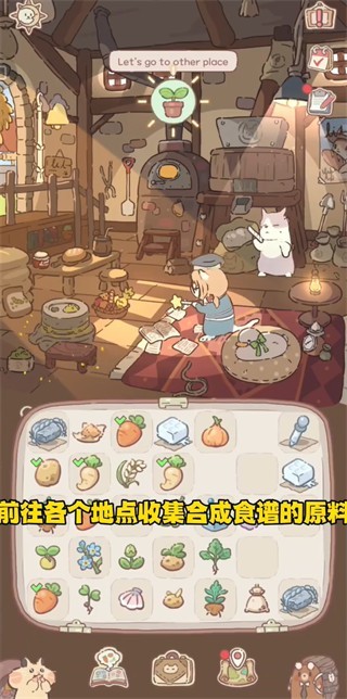 2、玩家可以前往各个地点,通过合成玩法,收集食谱的原料。