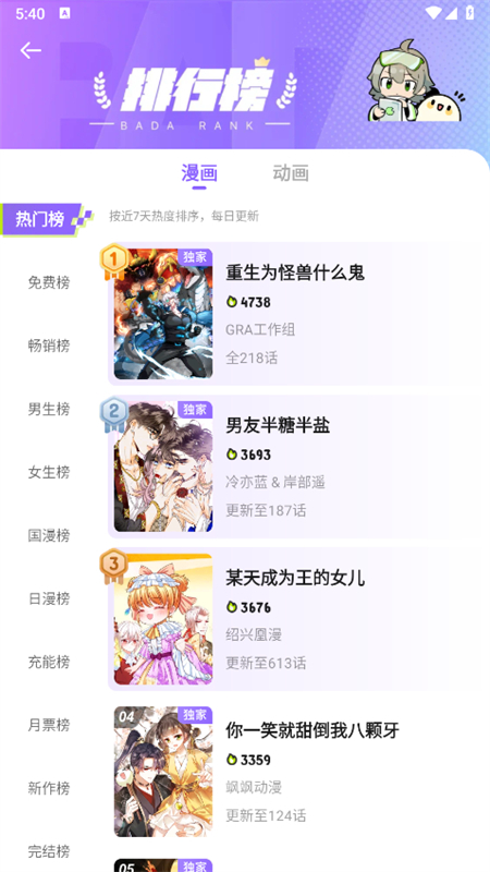 漫客栈是一款资源丰富、更新及时的漫画阅读app。在这里,我们可以轻松找到关于恋爱、校园、都市、热血、悬疑等类型的埋怨作品。平台内的漫画资源更新频率很高,热门连载基本都会同步更新,让追更党不用到处找资源。同时,漫客栈还设有多种人气榜单和分类推荐,根据阅读热度和用户喜好进行整理,帮助读者快速发现优质漫画。所有的漫画资源也都是可以免费下载至本地的哦,即使在没有网络的情况下也能随时观看,帮助大家节省了不少的流量花费。