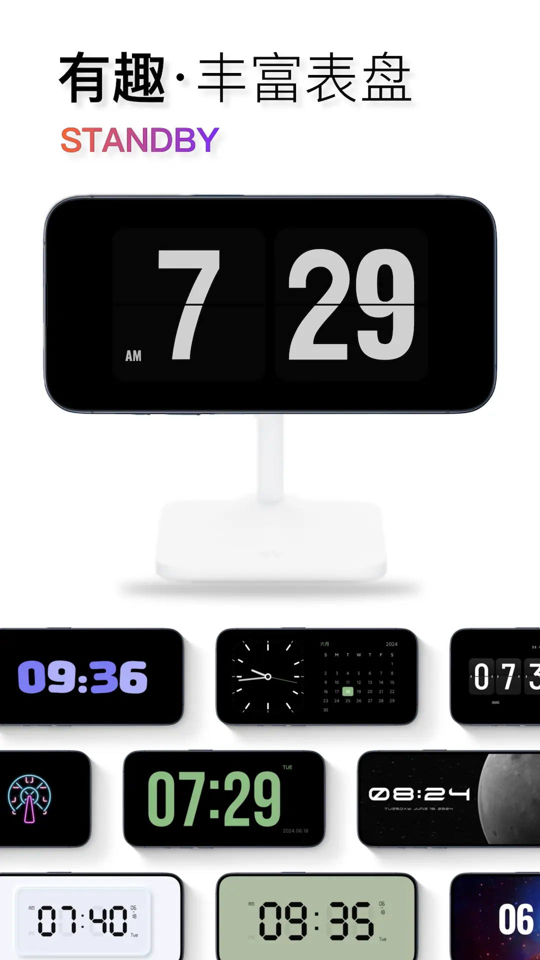 1、经典复古桌面时钟,全面屏动态翻页效果给您带来不一样的时光体验! 醒目的时间显示,在桌面或床头柜上任何角度都方便查看时间,是手机中一道亮丽的风景线