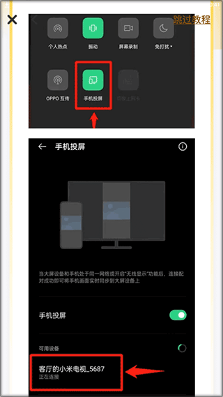 6、打开手机的投屏功能,搜索要投屏的电视点击连接即可。