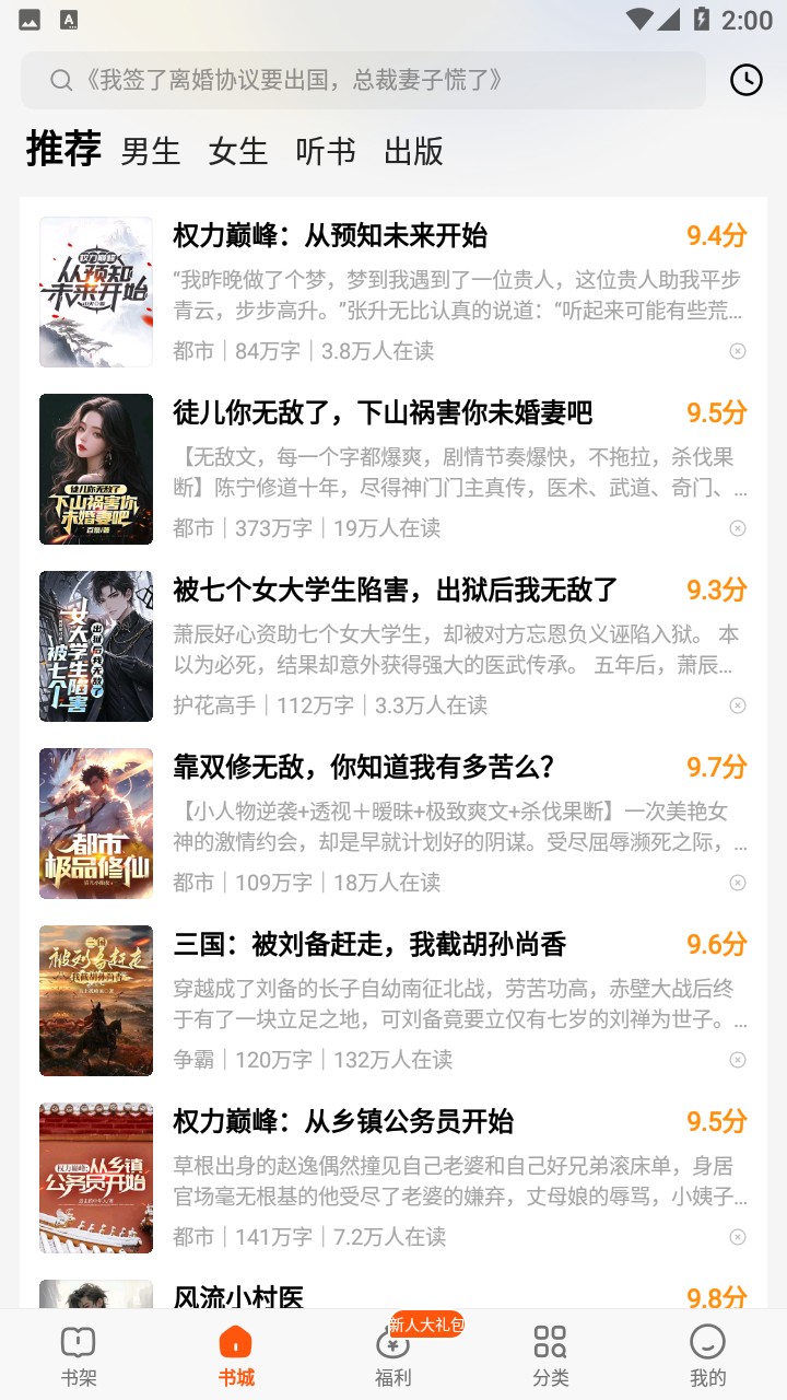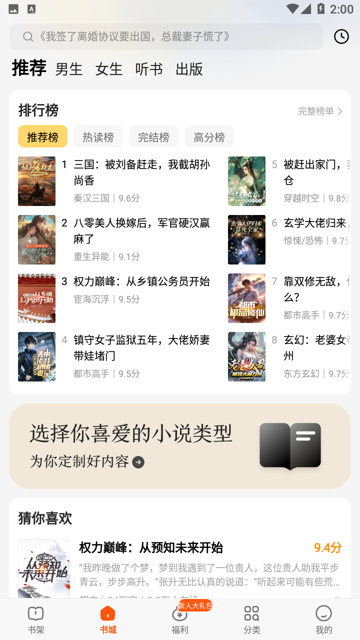 2、进入软件会发现书城中会有高分小说推荐。