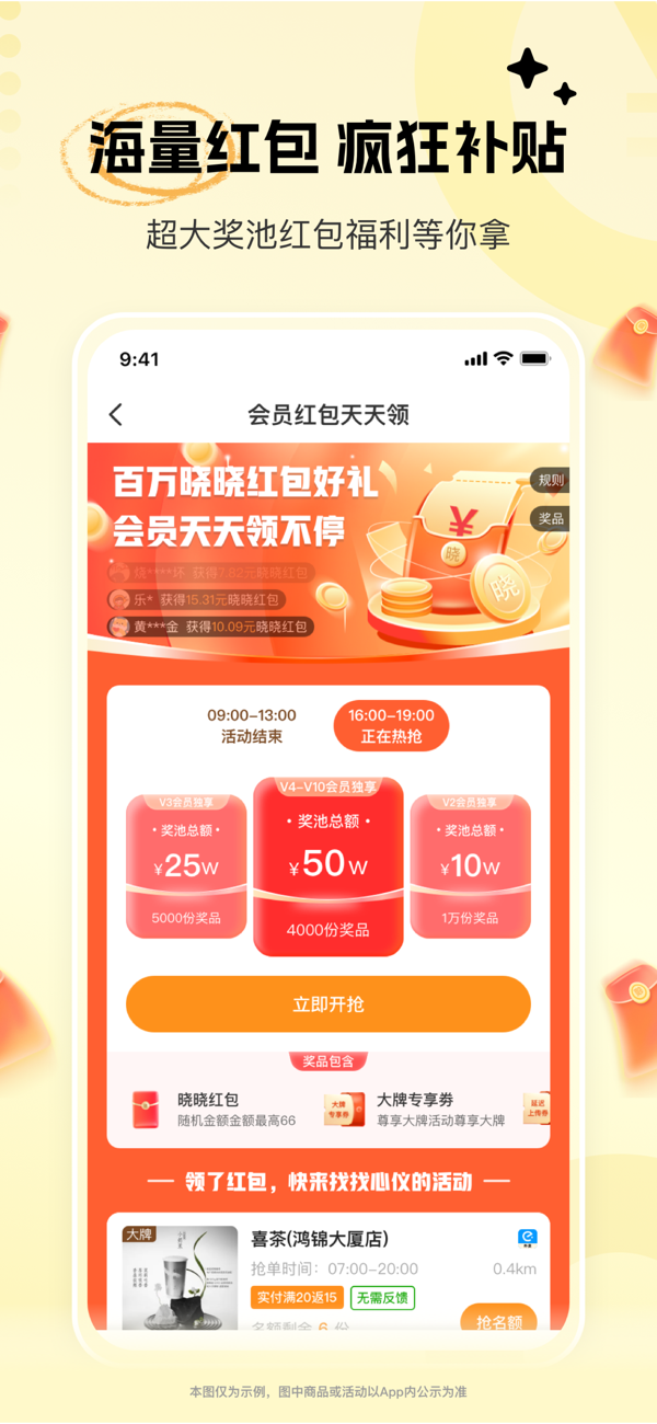 晓晓优选是一款实惠的外卖订购软件,平台的优惠力度非常大,每天都有大额外卖红包可以领取,还能够将你周边的优质美食活动推送给你,更有海量福利下午茶、奶茶、水果抢到手软!坚持每日签到还可以兑换丰富的福利礼品和卡券红包,绝对是一款更加省钱的吃外卖喝奶茶软件,有需要的话就赶快点击下载吧!