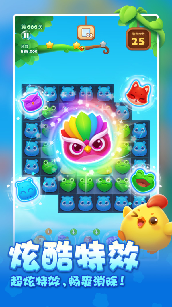 把三个颜色相同的小动物连成一条直线,即可消除。达到指定的目标通关后。游戏的模板有四种分别是分数过关、指定消除、获得金豆荚、云朵关卡。